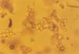 Рис. 7. Микрофотография аморфных кристаллов ксантина в мочевом осадке 7,5-летнего кастрированного кота, получавшего орально аллопуринол для расстворения камней аммония урата в мочевом пузыре (неокрашено, увеличение Х 25). |