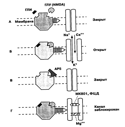 Рис. 1. Предполагаемый механизм активации и деактивации глутамат (ГЛУ)-М-метил-D-аспартат (КМDА)-рсцентор-канал комплекса. А и Б. Глутамат прикрепляется к рецептору и вызывает открытие капала сначала для Na+ и К+ , а после деполяризации мембраны — для Са2+ . Глицин (ГЛИ) модулирует эффекты ГЛУ. В. Конкурентные антагонисты рецептора, такие как АР5, могут предотвратить активацию ГЛУ. Г. Другие препараты и ионы могут блокировать открытый канал посредством неконкурентного антагонизма. К этим препаратам относятся фенциклидин (ФЦД) и экспериментальный нейронротективный препарат МК801. Mg2+ также может блокировать канал
