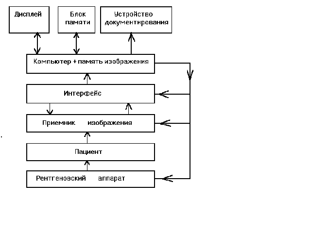 На рис.1 приведена схема типичной цифровой рентгенографической системы. Рентгеновская трубка и приемник изображения сопряжены с компьютером и управляются им, а получаемое изображение запоминается, обрабатывается (в цифровой форме) и отображается на телеэкране, составляющем часть пульта управления (или устройства вывода данных) оператора-рентгенолога.