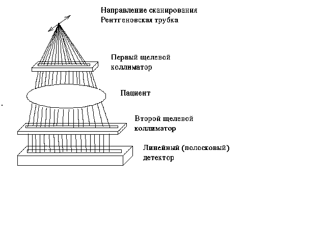 Системы получения изображения со сканированием рентгеновским пучком и приемником имеют важное преимущество, состоящее в том, что в них хорошо подавляется рассеяние. В этих системах один коллиматор располагается перед пациентом с целью ограничения первичного рентгеновского пучка до размеров, необходимых для работы приемника, а другой - за пациентом, чтобы уменьшить рассеяние. На рис.2 изображена линейная сканирующая система для получения цифрового изображения грудной клетки. Приемником в системе является полоска из оксисульфида гадолиния, считывание информации с которой ведется линейной матрицей из 1024 фотодиодов. Проекционные рентгенограммы синтезируются также сканерами компьютерной томографии и выполняют вспомогательную роль при выделении соответствующего сечения.