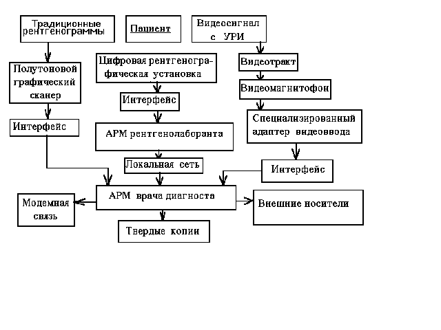 На рис.3 изображена принципиальная схема взаимодействия элементов системы получения, обработки, хранения и передачи рентгеновских диагностических изображений.