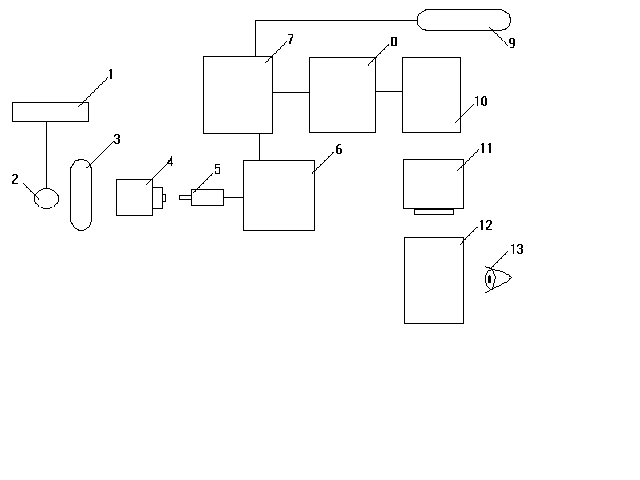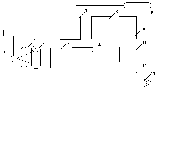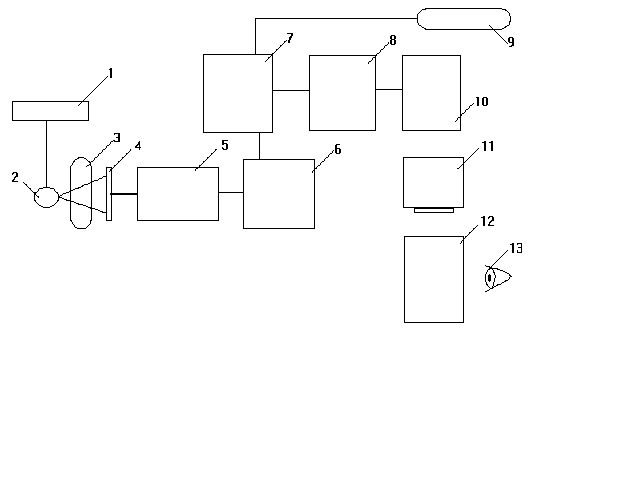 1-генератор; 2-рентгеновская трубка; 3-пациент; 4-ЭОП; 5-видеокамера; 6-аналого-цифровой преобразователь; 7-накопитель изображений; 8-видеопроцессор; 9-сеть; 10-цифро-аналоговый преобразователь; 11-монитор; 12-снимок; 13-рентгенолог.