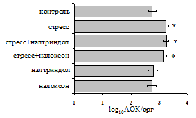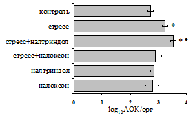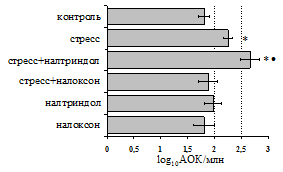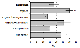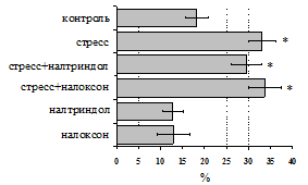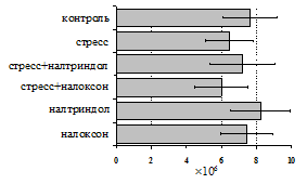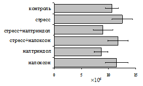 на фоне налоксона стимулирующий эффект ротационного стресса на антителогенез отменяется. Стрессиндуцированное усиление выраженности реакции ГЗТ отменяется как налоксоном, так и налтриндолом. Изолированное введение животным налтриндола или налоксона на количество АОК и степень выраженности ГЗТ влияния не оказывает. В эффекторную фазу иммунного ответа ротационный стресс (рис. 2) стимулирует как клеточный, так и гуморальный ответ, однако, в отличие от индуктивной фазы, на фоне блокады опиатных рецепторов эффекты стресса не модифицируются. Таким образом, стимуляция опиатных рецепторов в индуктивную фазу иммунного ответа играет важную роль в стрессиндуцированных изменениях иммуногенеза и ответственна за активацию функций иммунной системы при стрессе.