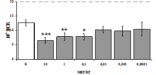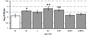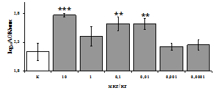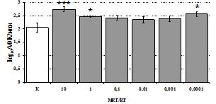 * - р < 0,05; ** - р < 0,01; *** - р < 0,001 к контролю по парному t-критерию Стъюдента..