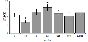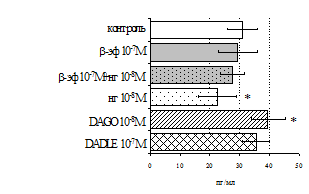 3. Впервые показано, что b-эндорфин в высоких (100 мкг/мл) дозах угнетает, в низких (0,0005 мкг/кг) дозах стимулирует гуморальное звено иммунитета и при этом не влияет на степень выраженности реакции гиперчувствительности замедленного типа. В клеточных культурах b-эндорфин стимулирует пролиферацию лимфоцитов и продукцию IL-4, не влияет на синтез IL-2, IFN-g и при этом усиливает степень поляризации Т-хелперов в направлении Th2-клеток. Доминирующая роль в реализации стимулирующих эффектов b-эндорфина на пролиферацию и продукцию IL-4 принадлежит d-рецепторам.