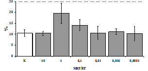 При анализе влияния b-эндорфина на продукцию исследуемых цитокинов мононуклеарами в присутствии ФГА были получены следующие результаты (рис. 21). Во фракции мононуклеаров ФГА, как и ЛПС, усиливает выработку IL-1b и не влияет на уровень IL-8. b-эндорфин стимулирует как спонтанную, так и ФГА-индуцированную продукцию IL-1b мононуклеарами. Уровень IL-8 под воздействием пептида в нестимулированных ФГА пробах не изменяется, а в стимулированных - снижается. Как следует из полученных данных, продукцию цитокинов семейства IL-1 нефракционированными лейкоцитами, нейтрофилами и мононуклеарами(но не очищенными моноцитами) b-эндорфин активирует, а продукцию IL-8 угнетает, таким образом, оказывая двоякое действие, с одной стороны, активируя процессы пролиферации и дифференцировки, а, с другой, угнетая хемотаксис. При этом в отличие от IL-1, депрессия IL-8