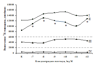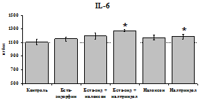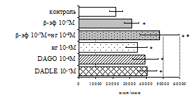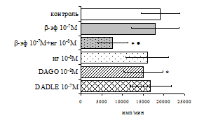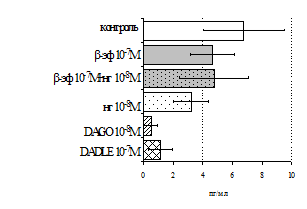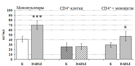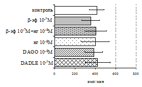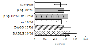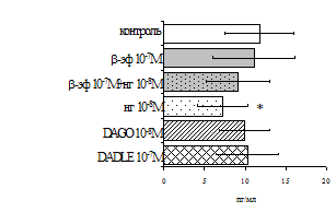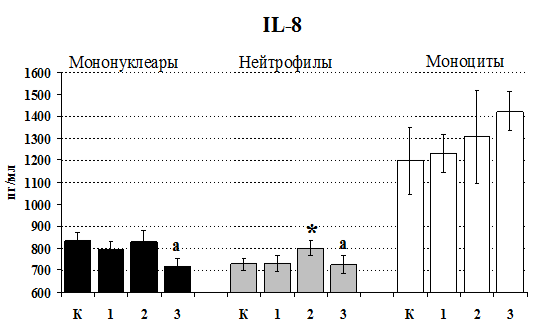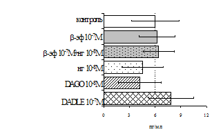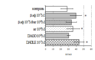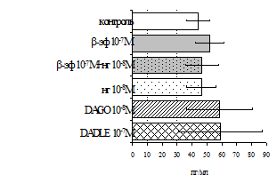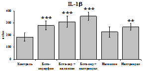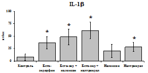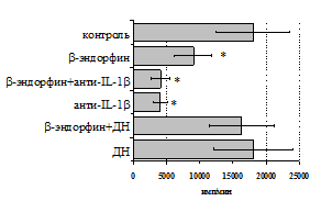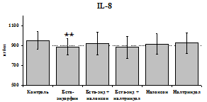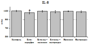 проявляется только в ЛПС и ФГА-индуцированных культурах и нивелируется опиатными антагонистами, что указывает на вовлечённость различных рецепторных механизмов в регуляцию синтеза IL-1b и IL-8 b-