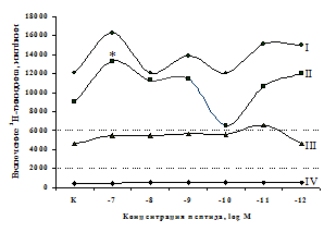 Пролиферативную активность оценивали по включению 3 H-метилтимидина. Радиоактивность проб определяли на жидкостном сцинтилляционном счетчике Guardian (Wallac, Финляндия). Для определения концентрации IL-1β, TNF-a, IL-6, IL-8, IL-1ra, IL-2, IL-4 и IFN-γ в супернатантах культур клеток использовали спектрофотометр Униплан (Пикон, Россия) и иммуноферментные тест-системы производства ООО Протеиновый контур, ООО Цитокин, Санкт-Петербург, Вектор-Бест, Новосибирск. В экспериментах invitro использовали агонист δ,μ-опиатных рецепторов β-эндорфин в концентрациях 10-7 -10-12 М; меланотропин потенцирующий фактор (MPF) -фрагмент 88-91 β-липотропина (Lys-Lys-Gly-Glu) в концентрациях 10-7 -10-12 М; μ-агонист опиатных рецепторов DAGO ([d-Ala2 ,N-Me-Phe4 ,Gly5 -ol]-энкефалин) в концентрациях 10-7 – 10-12 М; δ-агонист опиатных рецепторов DADLE ([d–Ala2 ,d-Leu5 ]-энкефалин) в концентрациях 10-7 –10-12 М; неселективный антагонист опиатных рецепторов налоксона гидрохлорид и селективный антагонист δ-рецепторов налтриндола гидрохлорид в концентрациях 10-6 , 10-8 , 10-10 М; липополисахарид (ЛПС) Escherichia coli O26:B6 - 0,1 мкг/мл (Sigma, США), фитогемагглютинин (ФГА) – 1,25; 2,5; 5,0; 10,0; 20,0 мкг/мл (Sigma, США), диклофенак натрия (ДН) 25 мкг/мл, моноклональные анти-IL-1b антитела – 2 мкг/мл.