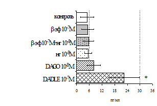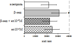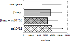 Результаты исследований влияния b-эндорфина на продукцию IL-1 и IL-8 во фракциях мононуклеаров и нейтрофилов представлены на рис. 20. b-эндорфин 10-7 М стимулирует спонтанную и ЛПС-индуцированную продукцию IL-1b мононуклеарами. Аналогичная картина наблюдается во фракции нейтрофилов. На фоне LPS наблюдается статистически значимое усиление продукции IL-1b. b-эндорфин 10-7 М стимулирует как спонтанную, так и LPS-индуцированную продукцию IL-1b нейтрофилами. ЛПС-индуцированная продукция IL-8 мононуклеарами и нейтрофилами под воздействием b-эндорфина снижается. В культурах без ЛПС пептид уровень IL-8 не изменяет.