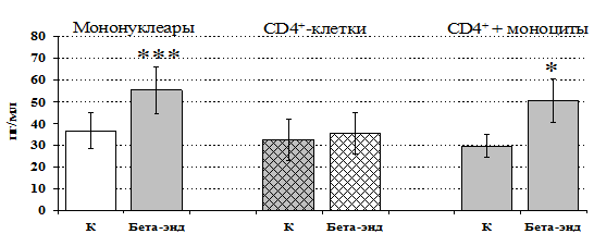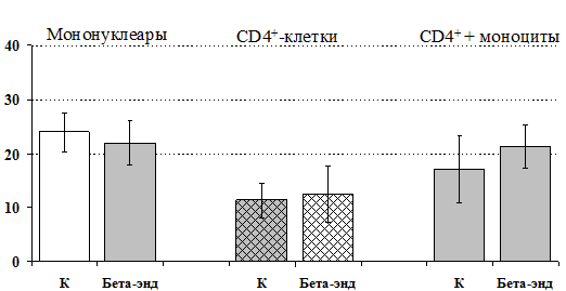 3. Клетки моноцитарно-макрофагального ряда играют важную регуляторную роль в направленности эффектов b-эндорфина в отношении функциональной активности CD4+ лимфоцитов.