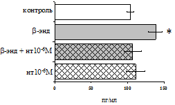 эндорфином. Ранее (Nandhra, 2000) был зарегистрирован угнетающий блокируемый налоксоном, эффект b-эндорфина на продукцию IL-8 клетками хориодецидуальной оболочки. Н.Л. Елизарова с соавт. (2001) установили, что аминокислотная последовательность β-эндорфина в молекуле препарата тимуса – тактивина обусловливает активацию функциональной активности лимфоцитов, усиление фагоцитоза и снижение способности моноцитов к адгезии, последняя функция отменялась налоксоном, в то время как усиление фагоцитоза налоксоном не отменялось. По нашим данным, депрессия продукции IL-8 отменяется селективным d-антагонистом налтриндолом, что свидетельствует о возможности реализации эффектов b-эндорфина через d-рецептор. В то же время, как показано в работе B.M. Sharp (2006), в зависимости от экспериментальной модели и объекта исследования d-рецептор может опосредовать проведение как стимулирующих, так и угнетающих сигналов.
