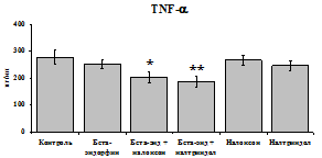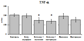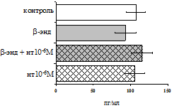 Рис. 18. Влияние b-эндорфина 10-7 М в условиях блокады опиатных рецепторов на продукцию IL-1b, TNF-a, IL-6 в нефракционированной клеточной суспензии в присутствии ЛПС.