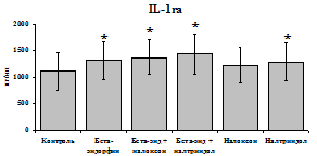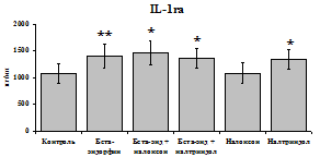 Рис. 19. Влияние b-эндорфина 10-7 М в условиях блокады опиатных рецепторов на продукцию IL-8 и IL-1ra в нефракционированной клеточной суспензии в присутствии ЛПС.