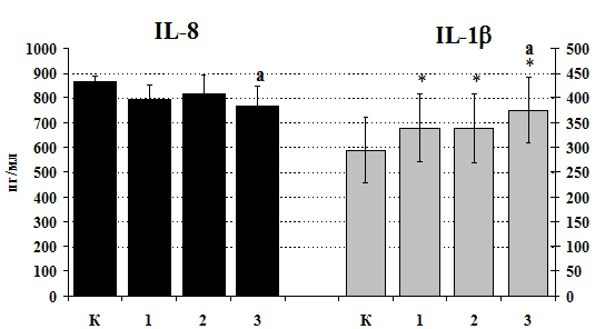 К – контроль, 1 - b-эндорфин, 2 – ЛПС, 3 – ЛПС+b-эндорфин. * - р < 0,05; ** - р < 0,01; *** - р < 0,001 к контролю, а - р < 0,05 к ЛПС по парному t-критерию Стъюдента..
