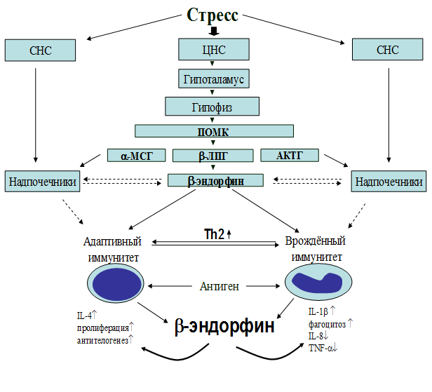Оценивая роль эндогенных нейропептидов в стрессиндуцированных изменениях иммунной системы необходимо отметить, что полученные данные прямо указывают на непосредственное участие эндогенных опиатов в активации иммунной системы. Направленность ряда физиологических эффектов эндогенных опиоидных пептидов при стрессе противоположна эффектам глюкокортикоидов и катехоламинов. Ранее глюкокортикоиды и катехоламины рассматривались исключительно как стрессреализующие факторы, в то же время их основная биологическая роль может заключаться в ограничении опасной для организма стрессиндуцированной активации иммунных процессов.
