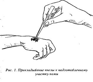 «1-я проба. На кожу поясницы кладется одна пчела. Жало извлекается через 5–10 сек. На следующий день проводятся анализы мочи и крови.