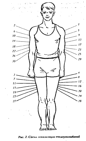 На рис. 2 приведена предложенная Н.П. Иойришем схема локализации пчелоужаливании. Цифрами обозначены места прикладывания пчел и последовательность проведения процедур по Дням.