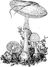 Бледная поганка относится к самым ядовитым грибам, отравление сопровождается высокой летальность (до 50%). Токсическое действие этих грибов обусловливается содержанием в них аманитоксина. Яд этого гриба не разрушается нагреванием и пищеварительными ферментами. Бледные поганки несколько похожи на шампиньоны, растут с июля по октябрь. Шляпка поганки выпуклая, позднее плоская, диаметром 8—10 см (рис. 4). Цвет шляпки желтоватый или зеленоватый, иногда с бледно-оливковым оттенком. Пластинки чистые, белые. Ножка гриба имеет белую манжетку и несколько утолщенное основание. Признаки отравления наступают через 10—12 ч. При этом отмечается бурное развитие желудочно-ки-шечных расстройств: появляются многократная рвота, резкая боль в животе, жидкий стул, желтуха, бессознательное состояние, в тяжелых случаях наступает смерть (1—2 дня).