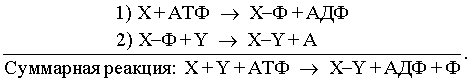 Источники энергии. В любом из перечисленных выше примеров непосредственным источником энергии, которую клетка использует для производства работы, служит энергия, заключенная в структуре аденозинтрифосфата (АТФ). В силу особенностей своей структуры это соединение богато энергией, и разрыв связей между его фосфатными группами может происходить таким образом, что высвобождающаяся энергия используется для производства работы. Однако энергия не может стать доступной для клетки при простом гидролитическом разрыве фосфатных связей АТФ: в этом случае она расходуется впустую, выделяясь в виде тепла. Процесс должен состоять из двух последовательных этапов, в каждом из которых участвует промежуточный продукт, обозначенный здесь X–Ф (в приведенных уравнениях X и Y означают два разных органических вещества; Ф – фосфат; АДФ – аденозиндифосфат):