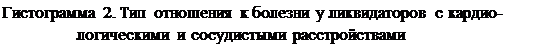Как видно из Гистограммы 2, среди ликвидаторов, имеющих органические сосудистые изменения в деятельности системы кровообращения, каждый четвертый адекватно относится к своему заболеванию, тогда как среди пациентов с кардиологическими расстройствами таких лишь 6%.