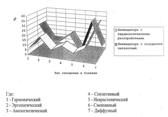 Выделенные группы ликвидаторов в целом отличаются по иерархии типов отношения к болезни. Так, на втором месте у пациентов с кардиологическими диагнозами находится эргопатическое отношение, на третьем - анозогно-зическое отношение, что соответствует интерпсихической модели.