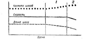 Биомеханические тесты выносливости позволяют установить, какой объем работы человек может выполнить и как долго может работать без снижения эффективности двигательной деятельности. Например, при беге с постоянной скоростью наступает момент, когда человек не может поддержать исходную длину шага (компенсированное утомление), а спустя еще некоторое время он вынужден снизить скорость (декомпенсированное утомление) (рис.1). Чем выносливее человек, тем дольше не наступает утомление.