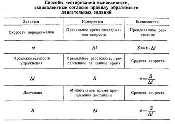 Согласно правилу обратимости двигательных заданий все три разновидности теста на выносливость эквивалентны (табл.1), т.е. при тестировании группы людей наиболее выносливые в одном из этих трех тестов будут наиболее выносливыми и в двух других.