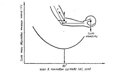 Проявляемая человеком сила зависит от позы, от углов в суставах. Влияние суставного угла на проявляемую силу иллюстрирует рис.28. Изображенный на нем график показывает, что, например, оптимальный угол в локтевом суставе близок к 80°. В этом случае угол между направлением тяги двуглавой мышцы плеча и костями предплечья близок к 90°.