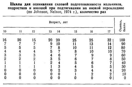 Общепринятым тестом силовых качеств является подтягивание на перекладине. Но далеко не каждый может подтянуться на высокой перекладине. Поэтому полезен тест, в котором человек выполняет возможно большее число подтягиваний на низкой перекладине (см. рис.4), и соответствующие педагогические шкалы (табл.2). С той же целью можно использовать «отжимания» (рис.3) и другие общедоступные упражнения