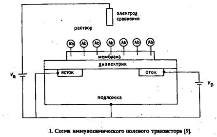 Главное ограничение всех этих методик состоит в том, что эффекты, связанные с изменением потенциала, невелики, и поэтому точность и чувствительность анализа в очень большой степени лимитируются эффектами фона. Сравнительно недавно для определения различных веществ стали применяться полевые транзисторы. По сути дела, полевой транзистор - это устройство для измерения заряда; принцип его действия представлен на рис.1. Область полупроводника между истоком и стоком, называемая каналом, обладает переменным сопротивлением, которое зависит от напряженности электрического поля на диэлектрике. В свою очередь это поле изменяется под влиянием напряжения на затворе VG , а также разности потенциалов на поверхности раздела мембрана - раствор. Поэтому в иммунохимических транзисторах иммобилизованные антитела и другие ионы, присутствующие в растворе, вносят вклад в это поле. Разность потенциалов между истоком и стоком Vp обусловливает электрический ток ID . Следовательно, измерение VD и VG должно отражать эффект связывания белков поверхностью. ПТ с мембраной, содержащей антигены к антителам против сифилиса, описан Коллинзом и Джанатой.
