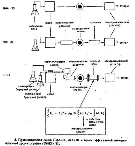 В гетерогенном электрохимическом иммуноферментном анализе полезной оказалась и высокоэффективная иммуноаффинная хроматография. Здесь колонку для ВЭИХ, представляющую собой, по сути дела, реактор многократного использования, заполняют антителами, ковалентно связанными с твердым носителем. При применении ферментной метки активность связанного фермента можно измерить путем введения субстрата и определения электроактивного продукта с помощью ЖХ-ЭХ-детектора. Режим проточно-инжекционной хроматографии позволяет тщательно контролировать состояние иммуносорбента, что очень важно для достижения хорошей воспроизводимости. Иммуносорбентные колонки стабильны по меньшей мере в течение 3 месяцев. Такой принцип положен в основу двухсайтовой иммуноферментной методики типа ELISA для определения IgG, в которой роль вторичных антител выполнял конъюгат анти-IgG козла с глюкозооксидазой, а определяли перок с ид водорода, образующийся после введения глюкозы в аффинную колонку. При времени инкубации менее 30 мин достигнута чувствительность 10-12 - 10-15М.
