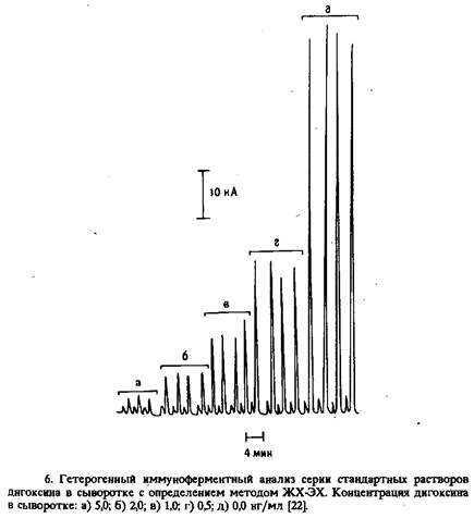 Калибровочную кривую для дигоксина можно построить путем определения пиковых токов растворов сыворотки, содержащих известное количество этого препарата. В варианте ЖХ-ЭХ достигнут предел обнаружения 50 пг/мл; в клинических анализах результаты хорошо согласуются с результатами РИА.