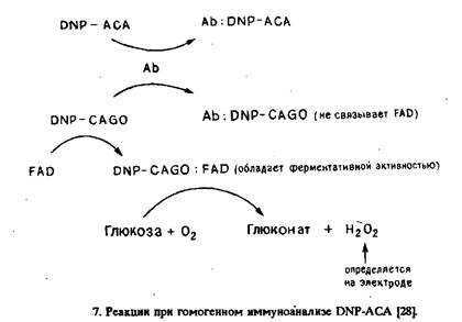 Принцип анализа представлен на рис.7. Определяемое вещество DNP-ACA и DNP-апоглюкозооксидаза конкурируют за данное количество антител против DNP. При добавлении флавинадениндинуклеотида последний может связываться со свободной DNP-CAGO с образованием обладающего ферментативной активностью комплекса DNP-CAGO: FAD, который катализирует образование Н2 02 из 02 в присутствии глюкозы. Таким образом, скорость образования Н2 02 является мерой концентрации свободной DNP-CAGOи, следовательно, концентрации DNP-