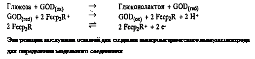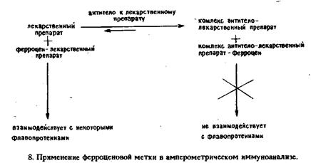 В первых работах с применением меченных ферроценом гаптенов была достигнута лишь ограниченная чувствительность. Сообщение Касса и др. о том, что ферроцен и его производные могут выполнять роль переносчика электронов между электродом и глюкозооксидазой v , оживило интерес к применению этой метки в гомогенном иммуноанализе. Показано, что при восстановлении флавина глюкозооксидазой в присутствии глюкозы окисленную форму фермента можно регенерировать путем переноса электронов на феррициний-ион, образующийся на электроде. Такая система не зависит от присутствия кислорода, так как феррициний-ион становится как бы вторым кофактором глюкозооксидазы: лидокаина.