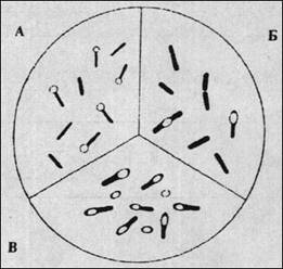 Рис. 2. Клостридии. А - Cl. tetani (барабанные палочки). Б - Cl. perfringens (C. welchii). B - Cl. botulinum (теннисные ракетки).