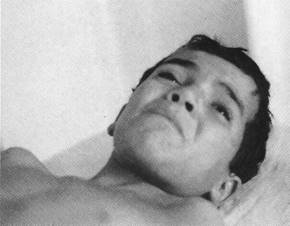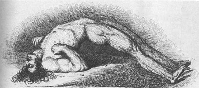 Судороги появляются спонтанно или при незначительных раздражениях (прикосновение, свет, голос). Во время судорог лицо больного покрывается крупными каплями пота, делается одутловатым, синеет, выражает страдание, боль. В зависимости от напряжения той или иной мышечной группы тело больного может принимать самые причудливые позы. Больной выгибается на постели в дугообразное положение, опираясь только пятками и затылком – это состояние называется опистотонус (Приложение 2). Все мышцы настолько напряжены, что можно видеть их контуры. Ноги вытянуты в струну, руки согнуты в локтях, кулаки сжаты.
