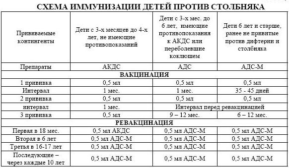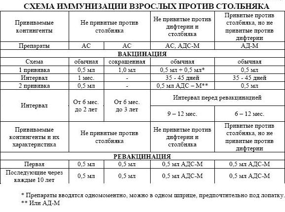 Активная иммунизация взрослых против столбняка проводится сорбированным анатоксином подкожно в виде 2-х инъекций по 0,5 мл с интервалом в 30—40 дней. Первую ревакцинацию производят через 9—12 месяцев 0,5 мл сорбированного анатоксина. Последующую ревакцинацию в той же дозировке проводят каждые 5—10 лет в течение работоспособного возраста. Детей иммунизируют одновременно против столбняка и дифтерии или столбняка, дифтерии и коклюша соответствующими комплексными препаратами.