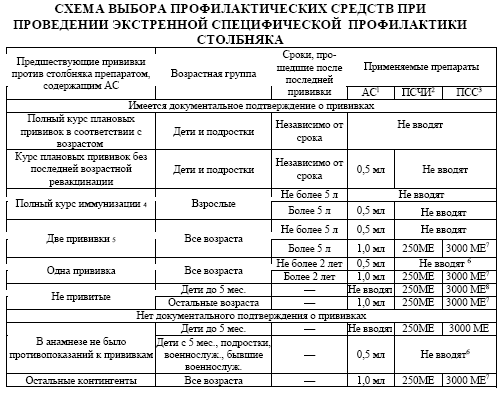 Если раненый в прошлом не вакцинировался, то сразу же после ранения вводят 0,5 мл адсорбированного столбнячного анатоксина, а затем, через 30 минут, в другой участок тела после десенсибилизации вводят очищенную и концентрированную противостолбнячную сыворотку в дозе 3000 ME. Через 5 дней повторяют введение анатоксина вторично в той же дозе. Первая ревакцннация проводится через 9—12 месяцев в дозе 0,5 мл адсорбированного столбнячного анатоксина.