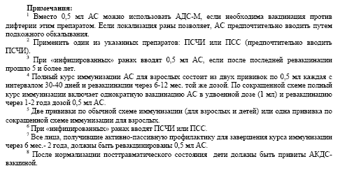 При загрязненных и обширных ранах к перечисленным выше показаниям добавляется еще одно: активной иммунизации подлежат и те пострадавшие, у которых вакцинация была завершена, но со времени введения последней дозы или со времени последней ревакцинации прошло более 5 лет.