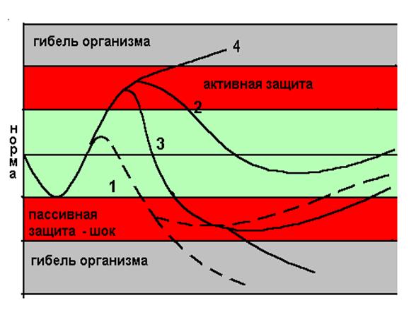 Первыйвариант характеризуется минимальным включением систем активной защиты. Он типичен для более низких ступеней развития животного мира. У высших позвоночных и человека встречается редко. В этом случае в ответ на агрессию развивается минимизация жизненных процессов – своеобразный аналог шока, отмечаемого у человека. В зависимости от интенсивности травмы процесс заканчивается либо гибелью организма, либо выздоровлением.Во втором варианте , в отличие от первого, выражена стимуляция систем активной защиты. При их состоятельности и ликвидации угрозы для жизни происходит нормализация измененных параметров. Включения средств пассивной защиты не происходит, и шок не развивается. Для третьего варианта типичен выраженный комплекс реакций активной и пассивной защиты. Однако максимальная стимуляция систем активной защиты оказывается несостоятельной. Это приводит к развитию комплекса пассивных оборонительных реакций — шока. Как и в первом варианте, этот процесс заканчивается либо гибелью, либо выздоровлением особи. И, наконец, последний вариант характеризуется неадекватной (чрезмерной) стимуляцией механизмов активной защиты. Это приводит, по-видимому, к «полому» систем регуляции и своеобразному «энергетическому кризису» из-за недостаточного обеспечения тканей' кислородом. Происходит быстрая гибель организма вследствие остановки дыхания и сердца на фоне повышенной двигательной активности, гипертермии и т. п.
