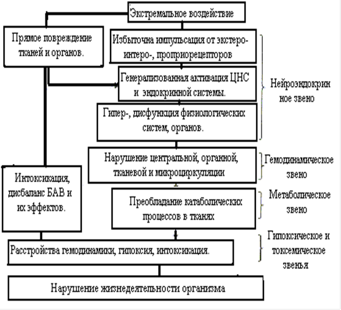 Для ответа на вопрос, звучащий в названии этого реферата необходимо также сравнить причины гемодинамических расстройств при шоке, коллапсе и массивной острой кровопотере. Считается, что при шоке изменения кровообращения возникают вторично, главным образом в результате нарушения деятельности центральной нервной системы. Экстремальное воздействие (этиологический фактор шока) действует двояко : вызывает прямое повреждение тканей и органов, а также вызывает избыточную афферентную импульсацию от экстерорецепторов, интерорецепторов и проприорецепторов. Оба этих процесса вызывают генерализованную активацию нервной и эндокринной систем, это приводит к гиперфункции и дисфункции различных физиологических систем, что и является причиной гемодинамических расстройств. В общем виде основные звенья патогенеза шока представлены на рисунке 2.