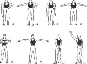 В подостром периоде используют активные, преимущественно облегченные, элементарные упражнения по основным осям движений в суставах в сочетании с общеукрепляющими и дыхательными упражнениями с постепенно возрастающей нагрузкой в положении лежа, а затем сидя и стоя. Наряду с активными упражнениями используют осторожные пассивные движения при возможно более полном расслаблении упражняемой конечности, считаясь с болевыми ощущениями (рис. 1).
