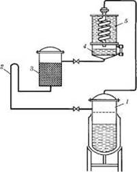 Екстращію органічними розчинниками (рис. 22) проводять у вертикальному шнековому екстракторі 1, в який завантажують суху м'якоть і назустріч їй безперервно подають екстрагент. Виснажена сировина (шрот) надходить на рекуперацію екстрагента в шне-ковий випарник 2, що обігрівається парою. Пари екстрагента конденсуються в холодильнику 3 і у вигляді конденсату направляються в збірник 4. Шрот, звільнений від екстрагента, за допомогою шнека 5 вивантажується в збірник відходів. Витяжка, насичена кароти-ноїдами, подається у вакуум-випарний апарат 6, де після видалення екстрагента одержують пасту каротиноїдів, яку купажують оліею до стандартного вмісту каротиноїдів.