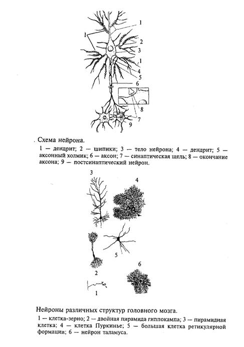 Нейрон является главной клеткой центральной нервной системы. Формы нейронов чрезвычайно многообразны, но основные части неизменны у всех типов нейронов. Нейрон состоит из следующих частей: сомы (тела) и многочисленных разветвленных отростков. У каждого нейрона есть два типа отростков: аксон, по которому возбуждение передается от нейрона к другому нейрону, и многочисленные дендриты (от греч. дерево), на которых заканчиваются синапсами (от греч. контакт) аксоны от других нейронов. Нейрон проводит возбуждение только от дендрита к аксону.