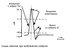 Таким образом, выражением возбуждения нейрона является генерация на мембране нейрона потенциала действия. Его длительность в нервных клетках составляет величину около 1 /1000с (1 мс). Описанная последовательность событий приведена на рис. 5.