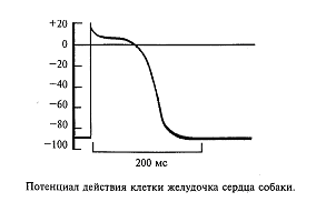 Подобные потенциалы действия могут возникать и в других клетках, назначение которых - возбуждаться и передавать это возбуждение другим клеткам. Например, сердечная мышца имеет в своем составе специальные мышечные волокна, обеспечивающие бесперебойную работу сердца в автоматическом режиме. В этих клетках также генерируются потенциалы действия (рис. 6). Однако они имеют затянутую, почти плоскую вершину, и длительность такого потенциала действия может затянуться до нескольких сот миллисекунд (сравните с 1 мс у нейрона). Такой характер потенциала действия мышечной клетки сердца физиологически оправдан, так как возбуждение сердечной мышцы должно быть длительным, чтобы кровь успела покинуть желудочек. С чем же связан такой затянутый потенциал действия у этого типа клетки? Оказалось, в мембране этих клеток натриевые ионные каналы не так быстро закрываются, как в нейронах, т. е. натриевая инактивация затянута.