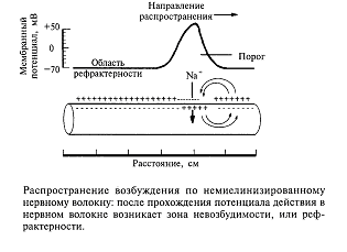Как происходит распространение возбуждения по нервному волокну? Вначале разберем случай немиелинизированного нервного волокна. На рис.8 показана схема нервного волокна. Возбужденный участок аксона характеризуется тем, что мембрана, обращенная к аксоплазме, заряжается положительно относительно экстраклеточной среды. Невозбужденные (покоящиеся) участки мембраны волокна отрицательны внутри. Между возбужденным и невозбужденным участками мембраны возникает разность потенциалов и начинает протекать ток. На рисунке это отражено линиями тока, пересекающими мембрану со стороны аксоплазмы,-выходящий ток, который деполяризует соседний невозбужденный участок волокна. Возбуждение движется по волокну только в одном направлении (показано стрелкой) и не может пойти в другую сторону, так как после возбуждения участка волокна в нем наступает рефрактерность - зона невозбудимости. Нам уже известно, что деполяризация приводит к открыванию потенциалзависимых натриевых каналов и в соседнем участке мембраны развивается потенциал действия. Затем натриевый канал инактивируется и закрывается, что и приводит к зоне невозбудимости волокна. Эта последовательность событий повторяется для каждого соседнего участка волокна. На каждое такое возбуждение тратится определенное время. Специальные исследования показали, что скорость проведения возбуждения немиелинизированных волокон пропорциональна их диаметру: чем больше диаметр, тем выше скорость движения импульсов. Например, немиелинизированные волокна, проводящие возбуждение со скоростью 100 - 120 м/с, должны иметь диаметр около 1000 мкм (1 мм).