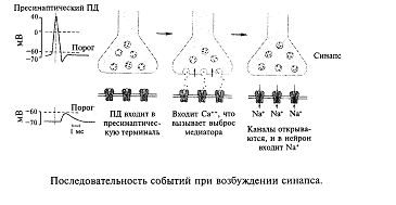 Потенциал действия, пришедший по пресинаптическому волокну к синапсу, вызывает деполяризацию, которая включает кальциевый насос, и ионы кальция поступают в синапс; ионы кальция связываются белками мембраны синаптических пузырьков, что приводит к активному опорожнению (экзоцитозу) пузырьков в синаптическую щель. Молекулы медиатора связываются (узнающим центром) соответствующими рецепторами постсинаптической мембраны, при этом открывается ионный канал. Через мембрану начинает протекать ионный ток, что приводит к возникновению на ней постсинаптического потенциала. В зависимости от характера открытых ионных каналов возникает возбудительный (открываются каналы для ионов натрия и калия) или тормозной (открываются каналы для ионов хлора) постсинаптический потенциал.