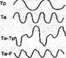 Рис. 16 Схема регистрации ЭЭГ при монополярном отведении (1) с референтным электродом (R) а мочке уха и биполярных отведениях (2): O - затылочное отведение; P -теменное отведение; C - центральное отведение; F - лобное отведение; Ta - переднее височное отведение, Tp - заднее височное отведение; d - правое полушарие; s - левое полушарие; (1): К - напряжение под референтным ушным электродом; 0 - напряжение под активным электродом, К-0 — запись, получаемая при монополярном отведении от правой затылочной области; (2): Тр — напряжение под электродом в области патологического очага; Та - напряжение под электродом, стоящим над нормальной мозговой тканью; Та-Тр, Тр-0 и Та-Р - запись, получаемая при биполярном отведении от соответствующих пар электродов.