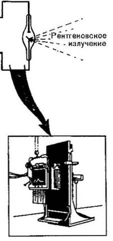 В состав типового рентгенодиагностического аппарата входят питающее устройство, пульт управления, штатив и рентгеновская трубка. Она-то, собственно, и является источником излучения. Установка получает питание из сети в виде переменного тока низкого напряжения. В высоковольтном трансформаторе сетевой ток преобразуется в переменный ток высокого напряжения - от 40 до 150 кВ. Из вторичной обмотки трансформатора переменный ток поступает в систему выпрямителей, превращающих его в выпрямленный ток, идущий в одном направлении. Высоковольтный выпрямленный ток подают на рентгеновскую трубку, которая генерирует peнтгеновское излучение. Трубка закреплена на штативе. На нем же располагается экранно-снимочное устройство. Управление аппаратом несложно. Выбор и регулировка технических условий осуществляются автоматически с помощью микропроцессорной техники. В некоторых моделях телевизионный монитор и пульт управления вынесены в соседнее помещение, откуда врач и ведет исследование.